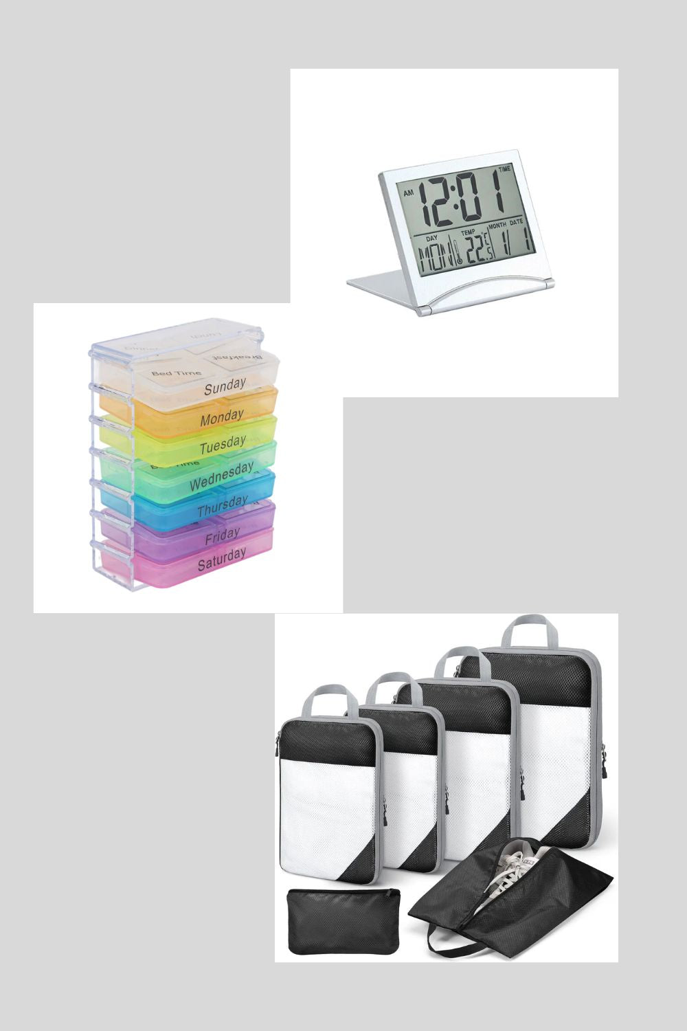 Everything you need for a perfectly organized weekend trip. This complete kit includes our Compression Packing Cubes Set for efficient packing, a compact Pill Box to keep your vitamins organized, and a Digital Travel Alarm Clock so you never miss your flight. Save $11 when you buy together vs. separately. Plus, enjoy free shipping on this bundle!
